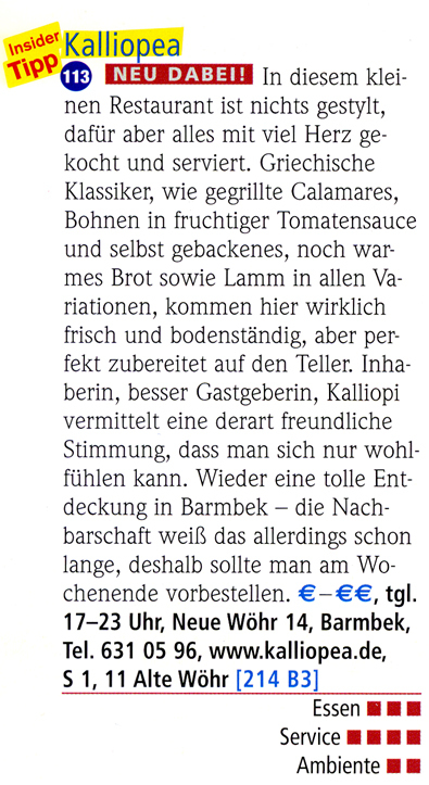 Inhaberin, besser Gastgeberin, Kalliopi vermittelt eine derart freundliche Stimmung, dass man sich nur wohlfühlen kann. Wieder eine tolle Entdeckung in Barmbek - die Nachbarschaft weiß das allerdings schon lange, deshalb sollte man am Wochenende vorbestellen."
